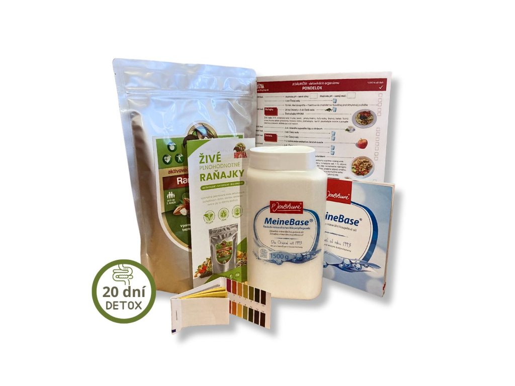 Balíček na 20 dňovú detoxikáciu so zľavou 10%. V balíčku nájdete plnohodnotné zásadotvorné živé raňajky HRYZKA 900 g, zásaditú kúpeľnú soľ MeineBase 1500 g, lakmusové papieriky na meranie pH a Jedálniček na detoxikáciu organizmu.