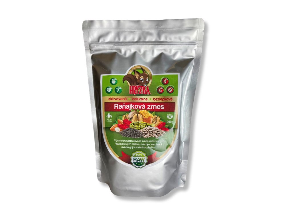 HRYZKA je aktivovaná raňajková zmes vyrobená z 10 kvalitných surovín. Obsahuje unikátny pomer bezlepkových obilnín, orechov, semienok, ovocia goji a vlákniny. Raňajky Hryzka boli vyvinuté preto, aby dodali Vášmu organizmu optimálnu výživu a maximum energie pre každé ráno. Raňajky Hryzka majú patentované zloženie s vyváženým pomerom sacharidov, bielkovín, zdravých tukov a vlákniny. Obsahuje živé enzýmy, pretože je vyrobená z aktivovaných RAW surovín.