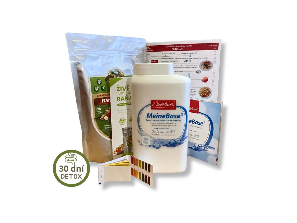 Balíček na 30 dňovú detoxikáciu so zľavou 10%. Balíček obsahuje plnohodnotné zásadotvorné raňajky HRYZKA 900 g, zásaditú kúpeľnú soľ MeineBase 2750 g, univerzálne lakmusové papieriky na meranie pH a Jedálniček na detoxikáciu organizmu.
