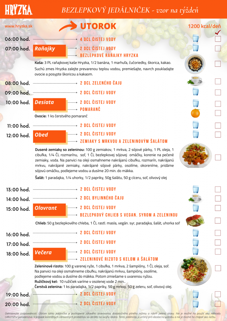 Ak hľadáte vzorový jedálniček bez lepku na celý týždeň, vypracovali sme pre Vás jedinečný týždenný plán, v ktorom môžete značiť ako postupujete. Tento jedálniček počíta s denným príjmom cca 1200 kcal, je zostavený výlučne z bezlepkových surovín, zohľadňuje správny pitný režim a podnecuje k racionálnemu stravovaniu. V prípade, že k takejto strave ešte doplníte pravidelný pohyb - celkové zlepšnie Vášho zdravotného stavu Vás príjemne prekvapí.