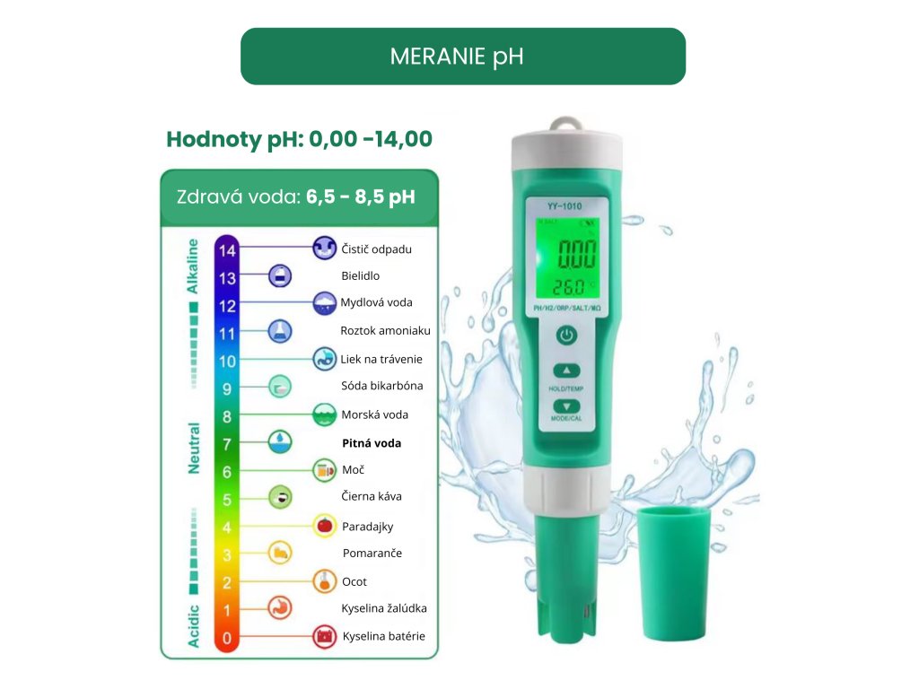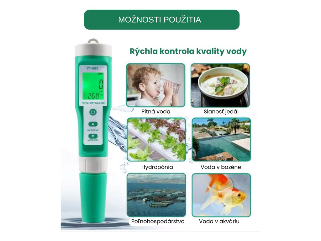Digitálny merač vody YY-1010 10 v 1 je všestranný merač kvality vody určený na profesionálne meranie rôznych parametrov kvapalín vrátane zásaditosti (pH), obsahu vodíka (H2), oxidačno-redukčného potenciálu (ORP), rezistencie vody - odporu vody voči elektrickému prúdu (RES MΩ), elektrickej vodivosti (EC), celkového obsahu rozpustených solí - vodný kameň (Salt), slanosti (%), mernej hmotnosti (S.G), obsahu živín (Fertile) a teploty (°C/°F). Toto zariadenie je vybavené veľkou obrazovkou s vysokým rozlíšením a podsvietením, rýchlymi meracími možnosťami a automatickou teplotnou kompenzáciou. Zaisťuje presné a ľahko čitateľné výsledky. Je vhodný pre širokú škálu aplikácií, ako je meranie kvality pitnej vody v domácnostiach, testovanie potravín, meranie bazénovej vody, medicínske použitie v laboratóriách, použitie pri výskume alebo vzdelávaní, meranie vody v akváriách alebo meranie obsahu živín pri hydroponickom pestovaní rastlín.